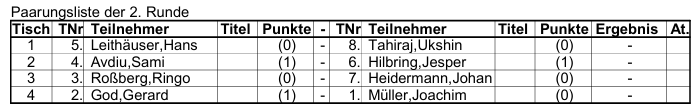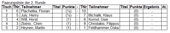Runde 11.Dominic Bütow vs Ingo Losch2.Horst Will vs Marius Völkel3.Chim Zlotnic vs Oskar Feldhammer4.Florian Plachetka vs Hans Leithäuser5.Klaus Michalik vs Filippos Christakis6.Mario Klasmeier vs Sami Avdiu7.Ukshin Tahiraj vs Gerard God8.Ringo